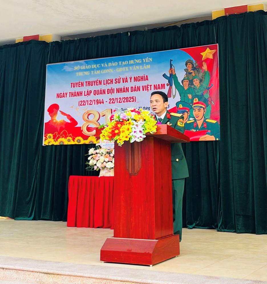 Đến dự với chương trình có Trung tá Đỗ Đức Duy - Nguyên cán bộ Ban chỉ huy quân sự Huyện Văn Lâm. Đồng chí đã nói chuyện với thầy trò trung tâm và ôn lại lịch sử ra đời và trưởng thành của quân đội nhân dân Việt Nam.