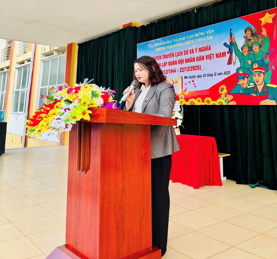 Vào sáng ngày 22/12, trong không khí trang trọng và ấm áp nghĩa tình, trung tâm GDNN- GDTX Văn Lâm đã tổ chức chương trình “ Tuyên truyền lịch sử và ý nghĩa ngày thành lập quân đội nhân dân Việt Nam”. Qua hoạt động này nhằm đẩy mạnh việc giáo dục cho các em học sinh học tập và noi theo truyền thống “ Uống nước nhớ nguồn” tốt đẹp của dân tộc ta.