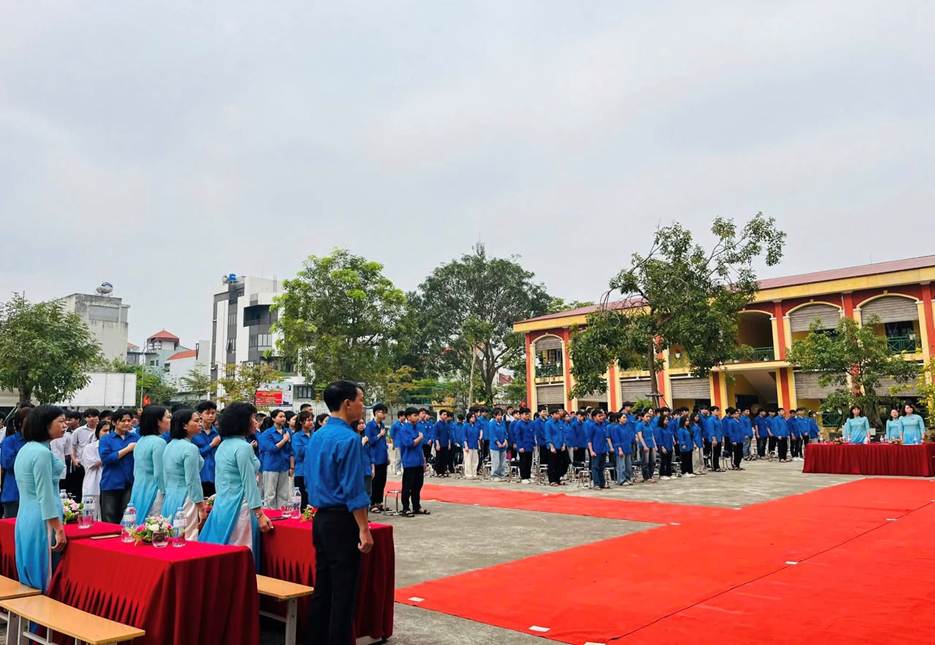 Ngay sau đó, buổi lễ được tiến hành trang nghiêm với nghi thức chào cờ, hát Quốc ca, Đoàn ca.
