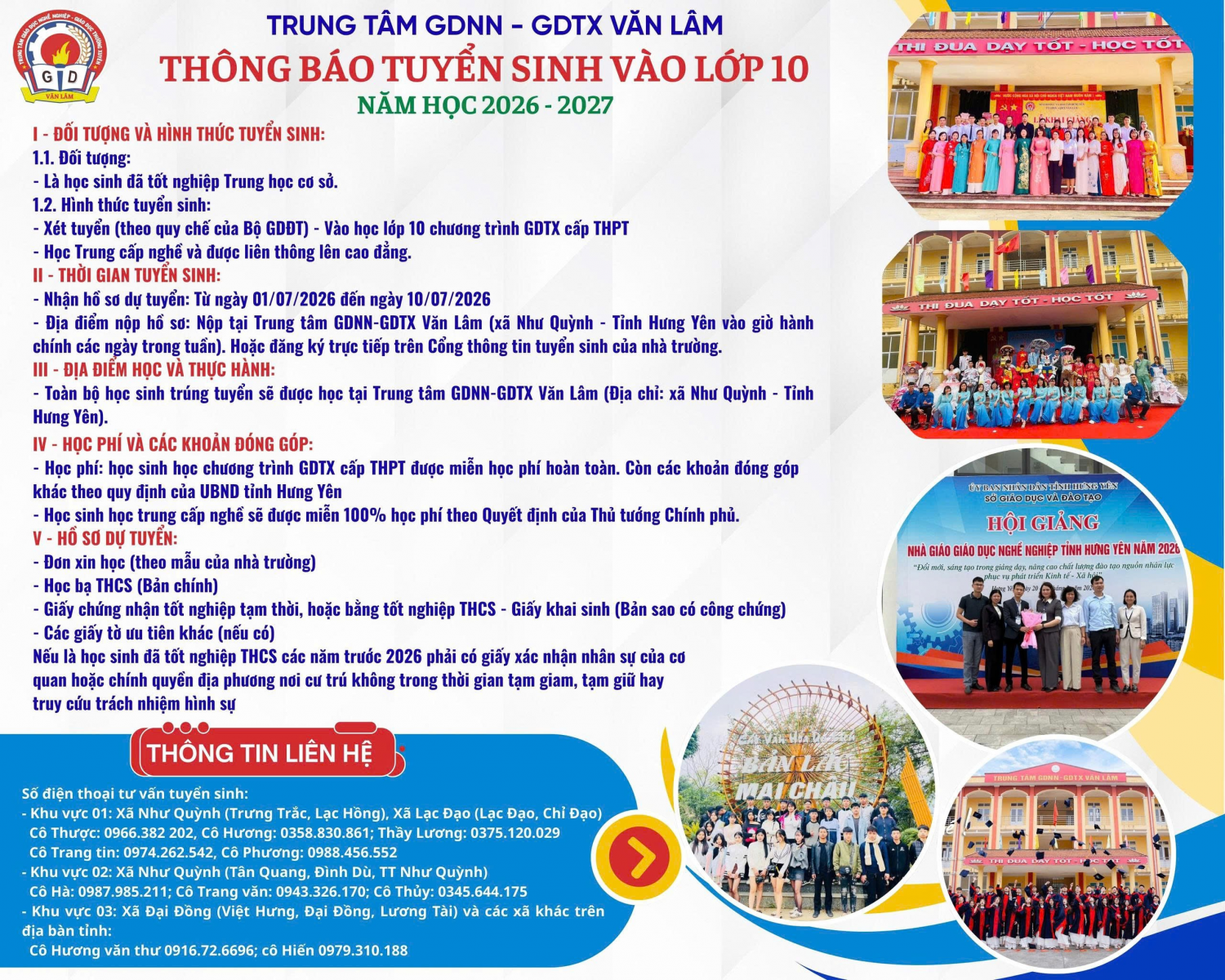 Trung tâm GDNN – GDTX Văn Lâm trân trọng thông báo và mong muốn được đồng hành cùng quý phụ huynh trong việc giáo dục định hướng tương lai cho con em mình, mỗi học sinh đều có cơ hội thành công khi được học tập trong môi trường phù hợp. Quý phụ huynh và các em học sinh có thể đăng ký học tại: đội 11- thôn Hành Lạc - xã Như Quỳnh - tỉnh Hưng Yên hoặc đăng kí trực tiếp trên cổng thông tin tuyển sinh của nhà trường. Thời gian đăng ký xét tuyển trên hệ thống tuyển sinh đầu cấp trực tuyến: từ 7h30 ngày 01/7/2026 đến 17h00 ngày 10/7/2026.